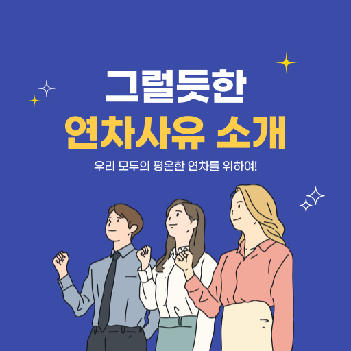 이상으로 그럴듯한 연차 사유에 대해 포스팅을 마칩니다. 본 포스팅을 통해 연차 사유가 막막하신 분들께 도움이 되는 포스팅이었길 바라며, 항상 행복하시길 바랍니다. 끝까지 열람 해 주셔서 감사합니다.