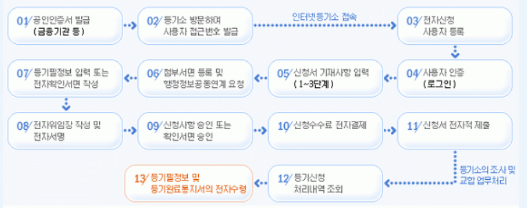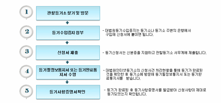 관할등기소는 대법원 인터넷등기소, 등기소 소개, 등기소 찾기에서 확인할 수 있으며 제출 후 접수 상황 확인은 등기소 신청서를 제출한 후 대법원 인터넷등기소, 등기신청 사건 처리 현황에 부동산 소재 지번을 입력하면 접수 상황을 확인할 수 있습니다. 인터넷으로 전자 신청할 경우에는 당사자가 직접 할 수도 있고 변호사나 법무사 등 자격 대리인이 당사자를 대리하여 신고하면 되며 사단이나 재단은 전자 신청이 불가하며 아래와 같은 정차로 진행됩니다.