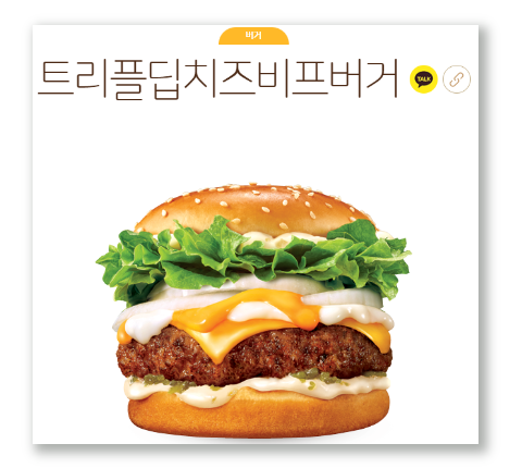 직화로 구워낸 두툼한 고기패티 두장이 들어가는 햄버거로, 두툼한 패티에서 나오는 육즙과 고소하고 짭짤한 치즈의 맛이 함께 느껴져 미국식 수제 햄버거 느낌을 즐길 수 있기 때문에 수제 햄버거 느낌이나 클래식한 버거를 좋아하시는 분들께 추천드리는 메뉴입니다. 826kcal, 당류 9g, 포화지방 24g, 단백질 50g 으로 고기와 치즈가 많은 대신 열량과 지방 함량이 조금 높습니다.