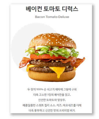 많은 분들이 좋아하시는 근본 햄버거로, 흔히 베토디라 줄여서 부르곤 합니다. 순쇠고기 패티 두장, 베이컨, 스위트 칠리 소스, 치즈, 마요네즈, 토마토, 양상추로 구성되어 있으며 다양한 재료가 아낌없이 풍부하게 들어가 있어 입안 가득 풍요로운 맛을 즐기실 수 있습니다. 저도 맥도날드에 방문하면 무조건 베토디를 시켜먹곤 합니다. 열량은 570kcal, 당류 14g, 단백질 29g, 지방 11g으로 구성되어 있으며 구성에 비해 높지 않은 열량과 많은 단백질을 함유하고 있습니다.