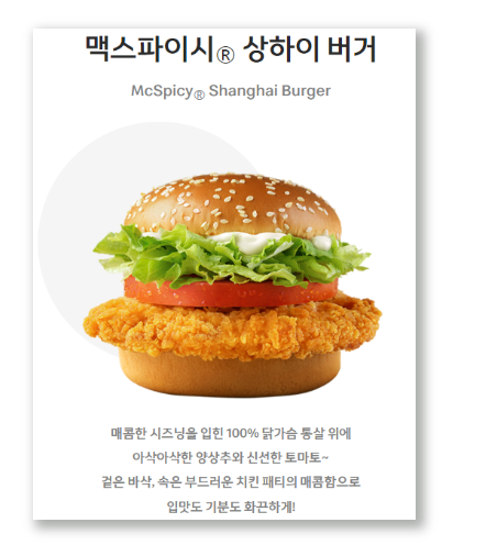 맥스파이시 상하이 버거는 빅맥만큼이나 많은 사람들이 찾는 메뉴 중 하나입니다. 그냥 치킨이 아닌 시즈닝이 첨가되어 있는 매콤한 치킨에, 부드러운 닭가슴 통살을 이용해 부드러운 육질과 함께 고소한 마요소스가 잘 어우러지는 맵짠고소한 햄버거입니다. 열량은 501kcal, 당류 9g, 단백질 24g, 지방 3g으로 구성되어 있으며 닭가슴살을 이용해 낮은 열량과 지방 함량을 보여주기 때문에 다이어트를 하시는 분들에게도 제격입니다.