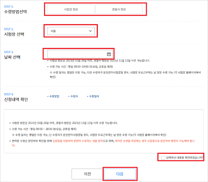 5) 수령방법 선택 후, 수령을 원하는 시험장 혹은 경찰서를 직접 선택한 뒤 날짜를 지정합니다.