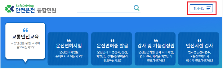 2) 홈페이지 우측 상단 전체메뉴를 클릭합니다.