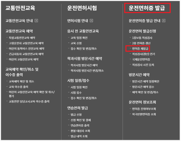 3) 운전면허증 발급 메뉴에서 면허증 재발급 메뉴를 클릭합니다.