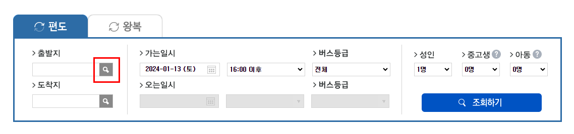 3) 편도 혹은 왕복을 선택한 뒤 돋보기 아이콘을 클릭합니다.