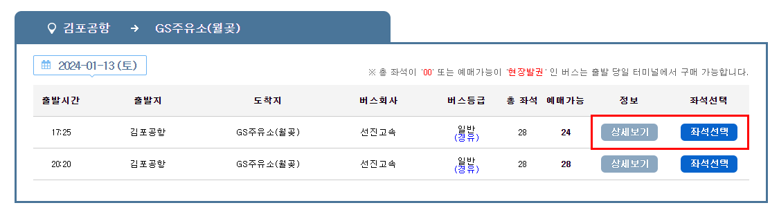 6) 출발시간을 확인한 뒤 좌석선택을 클릭합니다.