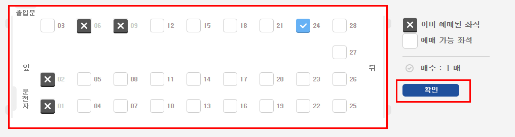 7) 좌석 배치도에서 좌석을 체크한 뒤 확인을 클릭합니다.