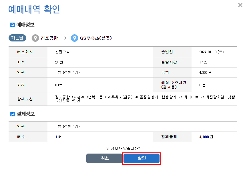 8) 예매내역을 확인 한 뒤 확인 버튼을 클릭해 예매를 완료합니다.