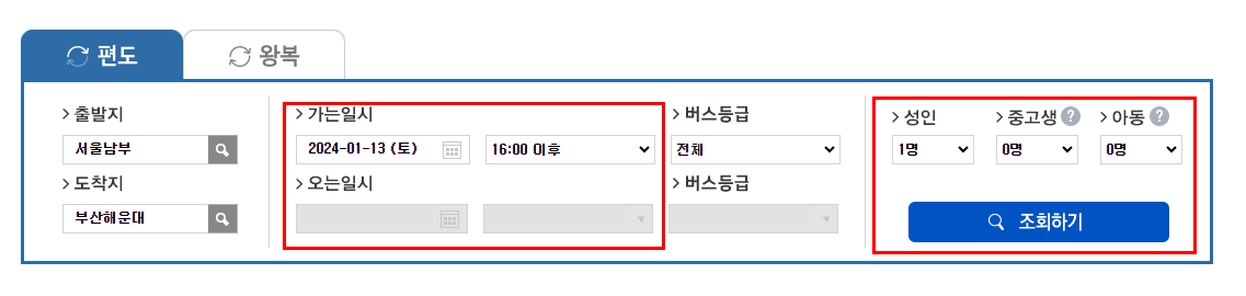 5) 출발 일시와 시간 등을 선택한 뒤 조회합니다.