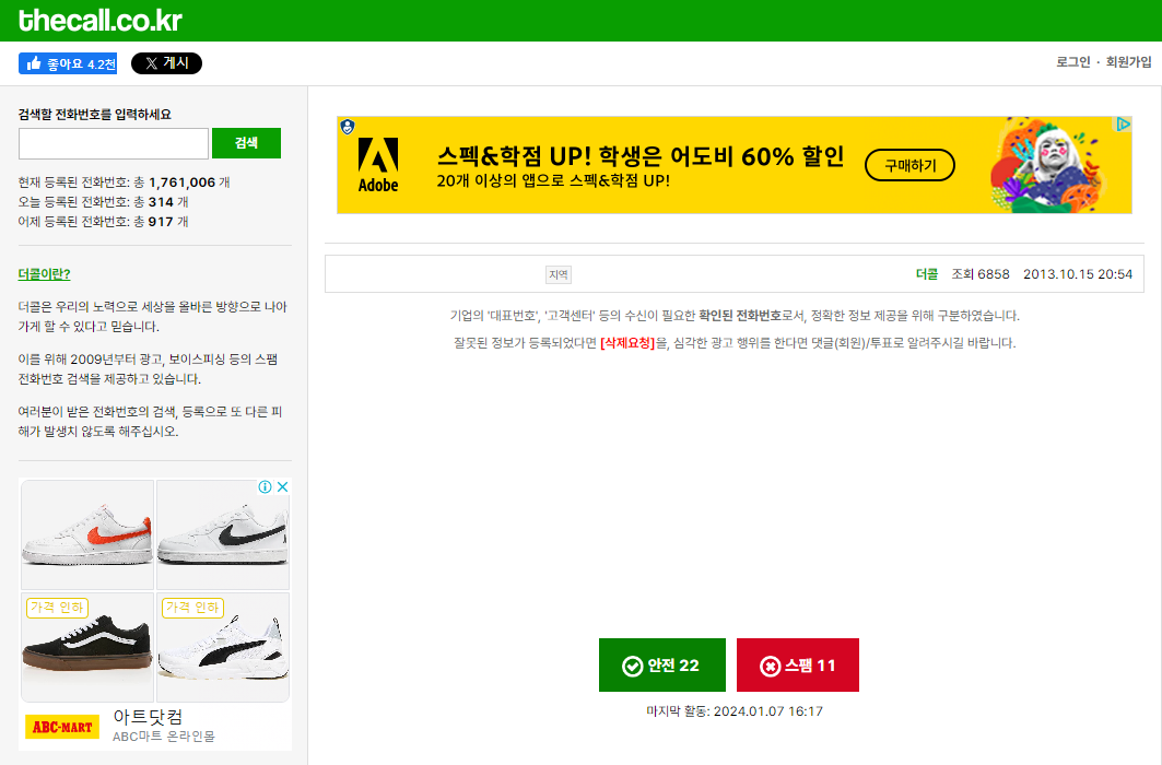 하단의 이미지를 클릭하시면 더 콜 웹사이트로 이동합니다. 모르는 전화번호를 검색창에 입력한 후 검색하면 해당 번화번호가 어떤 전화번호인지 확인 할 수 있습니다.