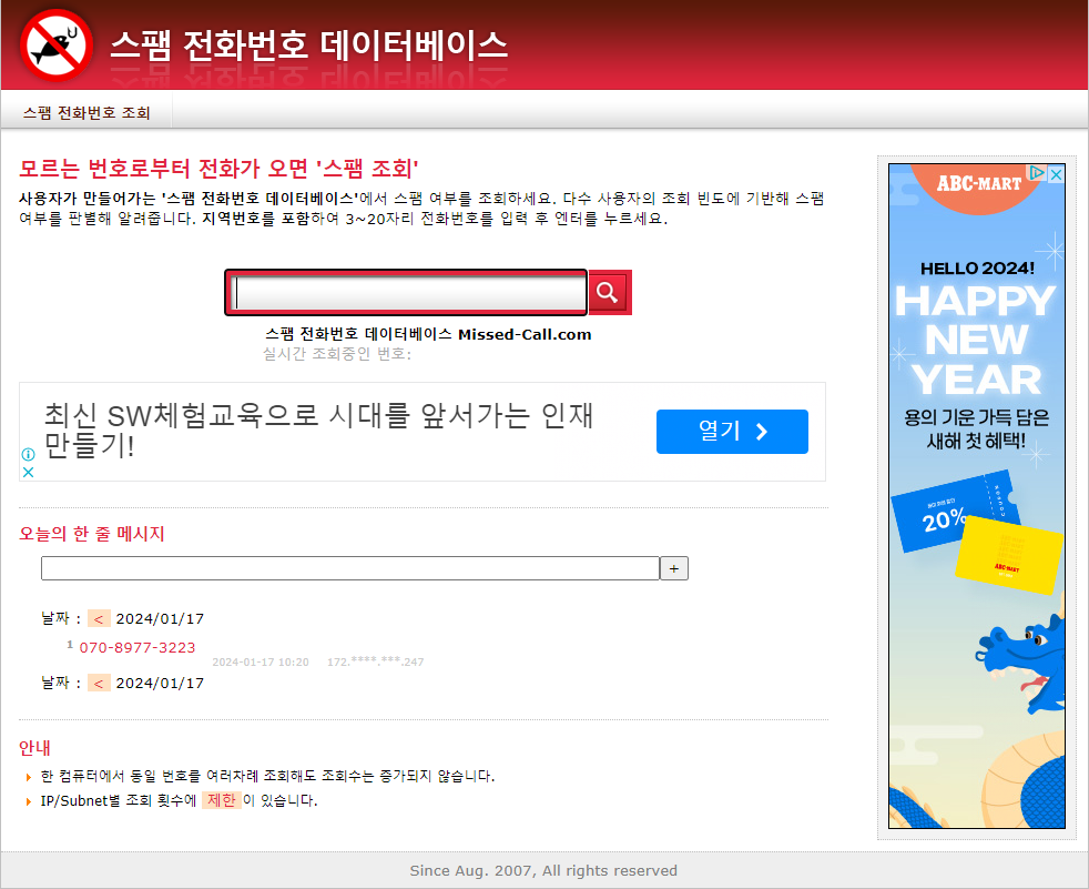 하단의 이미지를 클릭하시면 데이터베이스 웹사이트로 이동합니다. 데이터베이스는 사용자가 만들어가는 웹사이트로, 다수 사용자의 조회 빈도에 기반해 스팸 여부를 판별 해 전화번호 정보를 확인 할 수 있습니다.