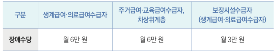 - 소득 수준 및 주거 형태에 따라 매월 장애 수당 지급
