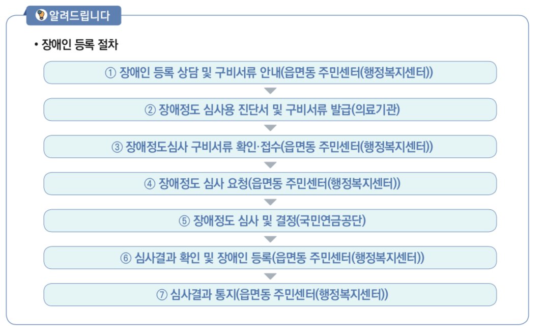 - 장애인등록증(복지 카드) 발급 후 국가 및 지자체의 각종 복지서비스 제공
