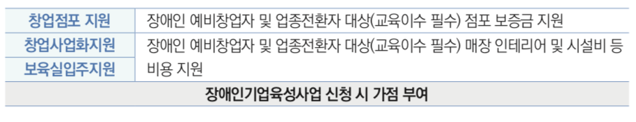 - 안정적 사업 성공 유도를 위해 장애인기업종합지원센터 내 사무공간 제공, 장애인기업 육성사업 안내, 전담 매니저 등 지원