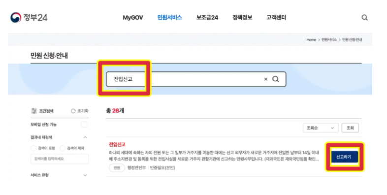 상단의 검색창에 전입신고 라고 검색한 뒤 신고하기 버튼을 클릭합니다.