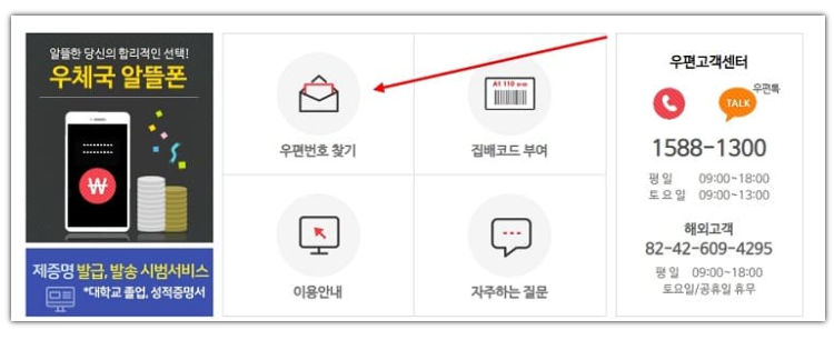 2) 메인 홈페이지 하단에 보이는 우편번호 찾기 메뉴를 클릭합니다.
