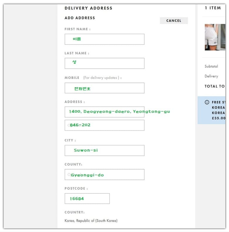 대개 해외 사이트는 Address1, Address2, City, Postcode, Country로 나뉘어져 있습니다. Address1에 주소를 몰아서 적을 수 있고 Address2에 나눠서 적을수도 있습니다. 몰아서 적는 경우 너무 길면 주소가 짤릴 수 있으니 주소 입력 후 다시 한번 확인 하시는것을 추천드립니다.