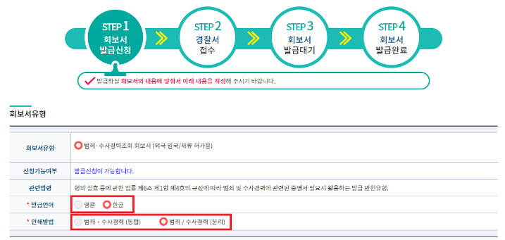 3) 주의사항을 확인 한 후, 발급언어와 인쇄방법을 선택합니다. 참고로, 범죄•수사경력을 통합하거나 분리하여 인쇄가 가능합니다.