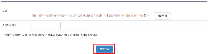 3) 실명 확인정보 처리 동의 체크 및 성명, 주민등록번호를 입력 후 실명확인을 합니다.