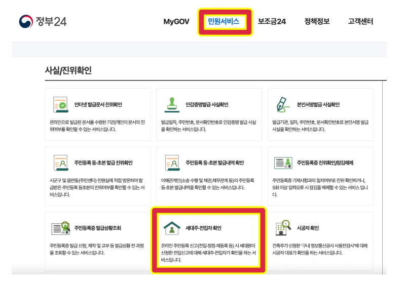 모두 완료한 뒤 민원 서비스를 클릭한 뒤 사실/진위확인 카테고리를 클릭한 후 세대주•전입자 확인 버튼을 눌러 승인을 진행해주시면 신고가 완료됩니다. 대개 3시간 이내로 민원 처리가 완료되며, 처리 결과는 사이트에서 바로 확인이 가능합니다.