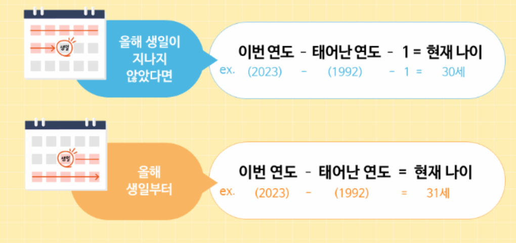 1) 올해 생일이 지나지 않은 경우 : 2023년도 - 태어난 연도 1992년 - 1 = 현재 나이 30세