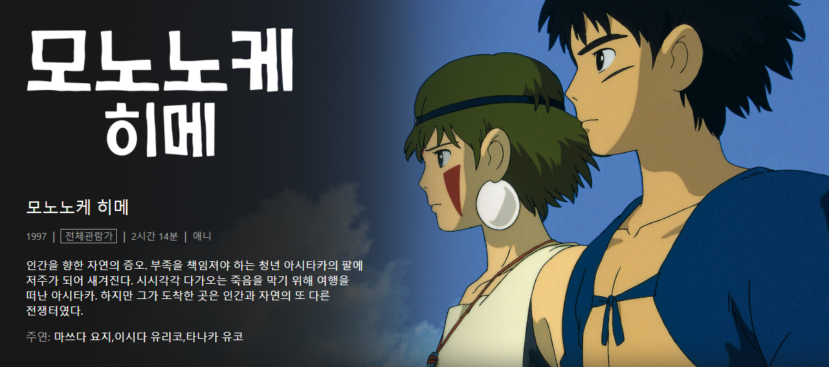 장르는 SF, 판타지, 가족 영화 입니다. 주인공이 사슴의 형상을 가진 여신 모노노케 히메를 마주친 후 그녀의 세계로 들어가며 벌어지는 일들에 대해 이야기를 다루고 있으며, 주인공은 자연과 숲의 신비한 힘, 인간과 자연 사이의 균형을 회복하기 위한 여정에 뛰어들게 됩니다. 철학적이고 많은 생각을 들게 하는 영화이니 한번쯤 시청 해보시길 바랍니다.