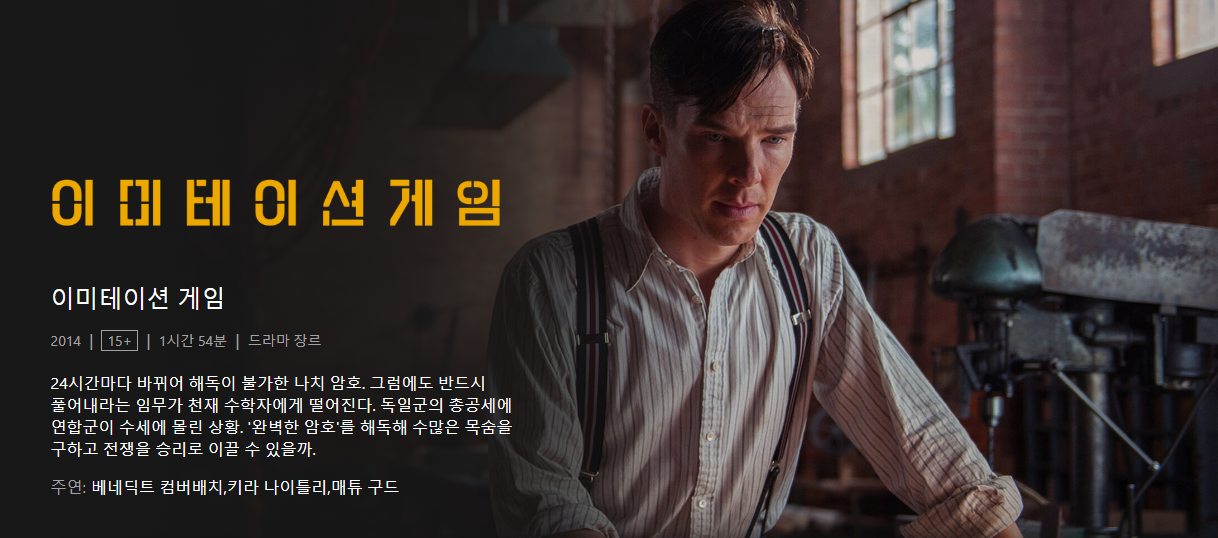 장르는 드라마 영화 입니다. 게임 수학 천재 주인공과 그의 동료들이 독일 나치의 암호를 해독하기 위한 노력과 스토리를 담고 있습니다. 주인공은 에니그마 기계를 해독하고, 나치의 비밀 통신을 해독하는데 성공하며 제 2차 세계 대전에 큰 영향을 미치게 됩니다. 단, 24시간마다 암호가 바뀌고 이것을 풀어내려는 재미가 엿보이는 영화로, 긴장감이 넘쳐 심장이 쫄깃쫄깃 해집니다.